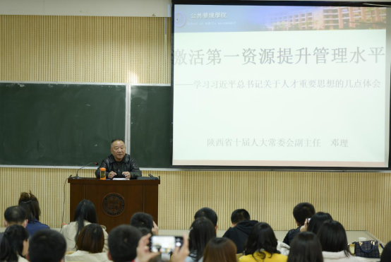 2020年11月6日下午在西北大学太白7111教室,西北大学565net必赢邀请到了陕西省人大十届常委会副主任、省决策咨询委员会副主任邓理同志,他为我院MPA师生带来题为“激活第一资源、提升管理水平——学习习近平总书记关于人才重要思想的几点体会”的专题讲座。本次讲座是565net必赢20周年院庆系列活动之一,也是西北大学MPA名家论坛系列之一。讲座由雷晓康院长主持,王尧宇副校长致辞,565net必赢部分教师和2020级全体MPA学生参加。
