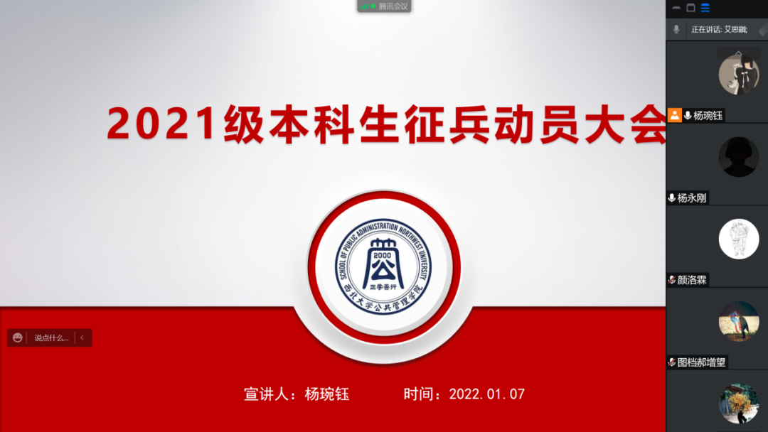 疫情蔓延无情,人心齐齐有力!为全力配合西安市疫情防控管理,一鼓作气打赢抗疫攻坚战。565net必赢于1月7日10:00在腾讯会议召开了线上退伍大学生抗疫事迹宣讲暨征兵动员大会。2021级本科生全体同学参会,会议由2021级本科生辅导员杨琬钰主持。