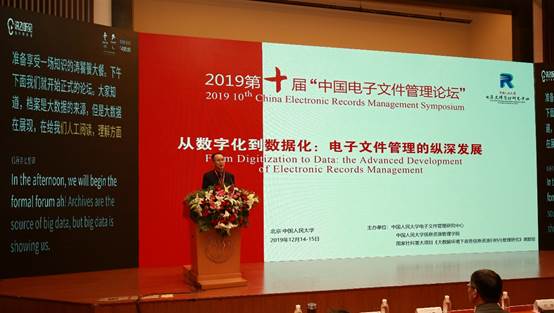 2019年12月14日至15日,由中国人民大学电子文件管理研究中心、中国人民大学信息资源管理学院、国家社科重大项目《大数据环境下政务信息资源归档与管理研究》课题组联合主办的第十届“中国电子文件管理论坛”在中国人民大学国学馆116报告厅隆重举行。国务院图书情报与档案管理学科评议组召集人、中国人民大学一级教授、原常务副校长冯惠玲,国家档案局副局长、中央档案馆副馆长付华,国家电子文件管理部际联席会议办公室副主任、国家密码管理局副局长于传斌,中国档案学会秘书长邓小军,中办信息中心副主任童新海等领导出席参加。我院黄新荣教授、李姗姗老师受邀参加。
