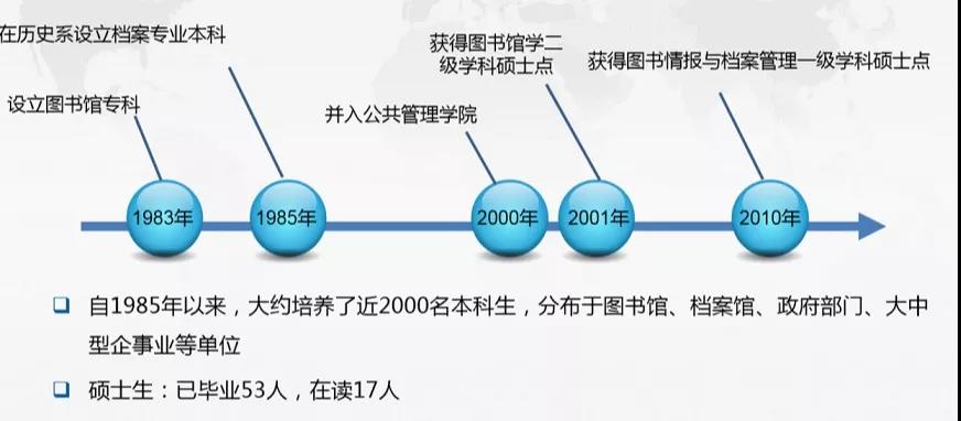 2000年,档案学专业并入565net必赢成立图书馆学与档案学系,后改名为公共信息资源管理系。2001年获得图书馆学二级学科硕士点,开始招收图书馆学研究生。2010年,获得图书情报与档案管理一级学科硕士点,2012年开始招收档案学专业硕士。