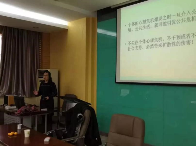 郑安云教授首先生动地给大家介绍心理危机的经典案例,深入浅出地讲解“心理危机”的重要内涵,她指出心理危机是指由于突然遭受严重灾难、重大生活事件或精神压力,使生活状况发生明显的变化,尤其是出现了用现有的生活条件和经验难以克服的困难,以致使当事人陷于痛苦、不安状态,常伴有绝望、麻木不仁、焦虑,以及植物神经症状和行为障碍。 郑安云教授就“福建南平重大凶杀案”、“马加爵事件”、“重庆市万州区公交坠江事件”等典型案例剖析了事件背后的心理危机发生逻辑。随后她指出,个体的心理危机爆发之时一旦介入公共环境、公共生活,就可能引发公共危机,不关注个体心理危机,不干预或者不给予社会支持,必然带来扩散性的伤害。郑安云教授讲到,当一个人出现心理危机时,当事人可能及时察觉,也有可能“不知不觉”,一个自以为遵守某种习惯了的行为模式的人,也有可能潜在着心理危机,染有严重不良瘾癖的人,常常潜伏着心理危机,当去戒除瘾癖时,心理危机便会暴露无遗。通过分析心理健康与心理病态个概念联系与区别,郑教授认为,心理健康与心理病态的是一个连续线,表现为“精神病—人格障碍—神经症—正常—超常”的连续光谱。